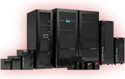 Racks que oferecem alta disponibilidade de energia com nobreaks/UPS IoT modulares trifásicos ou monofásicos e quadros de manobra inteligentes.