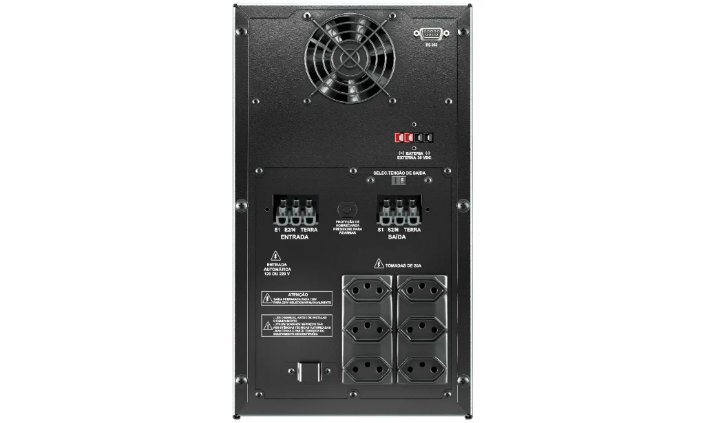- Conexão de saída: 6 tomadas 20A padrão ABNT NBR14136 + bornes.