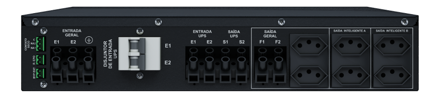 Conexões de saída: Bornes (saída geral); 2 Tomadas 20A NBR14136 (saída geral); 4 Tomadas 20A NBR14136 (saídas inteligentes A e B).