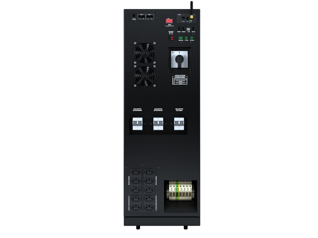 Conexões de saída: Bornes + 6 (seis) tomadas 20A NBR14.136 (saída geral) + 4 (quatro) tomadas 20A NBR14136 (saídas inteligentes A e B);